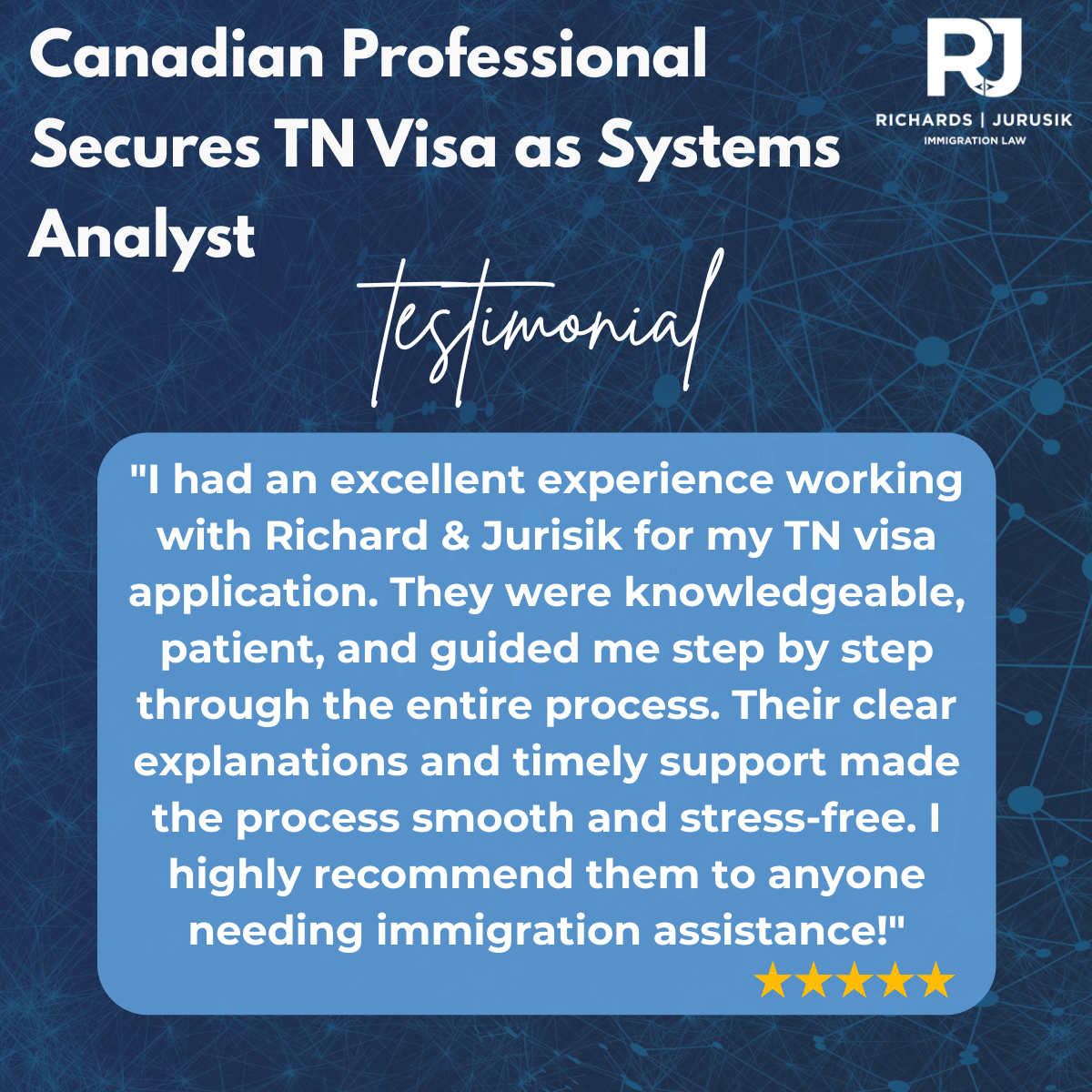 “I had an excellent experience working with Richard & Jurisik for my TN visa application. They were knowledgeable, patient, and guided me step by step through the entire process. Their clear explanations and timely support made the process smooth and stress-free. I highly recommend them to anyone needing immigration assistance!”