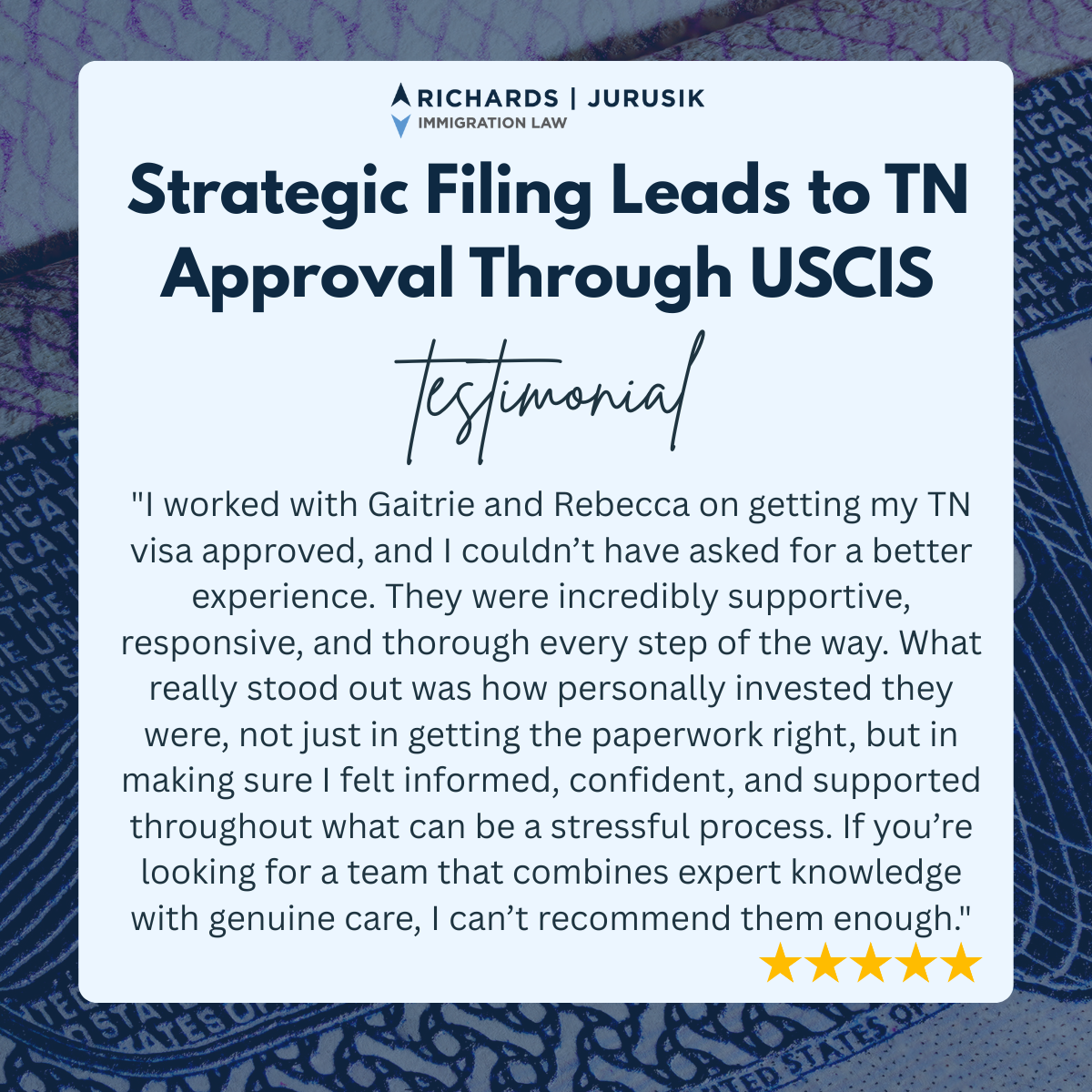 You may have questions regarding an H-1B Visa. We invite you to contact our team at Richards and Jurusik for detailed guidance and assistance. We aim to provide the most accurate and up-to-date information to make your immigration process smoother and less stressful. The immigration lawyers at Richards and Jurusik have decades of experience helping people work and live in the United States. Read some of our hundreds of 5-star client reviews! Contact us today to assess your legal situation.